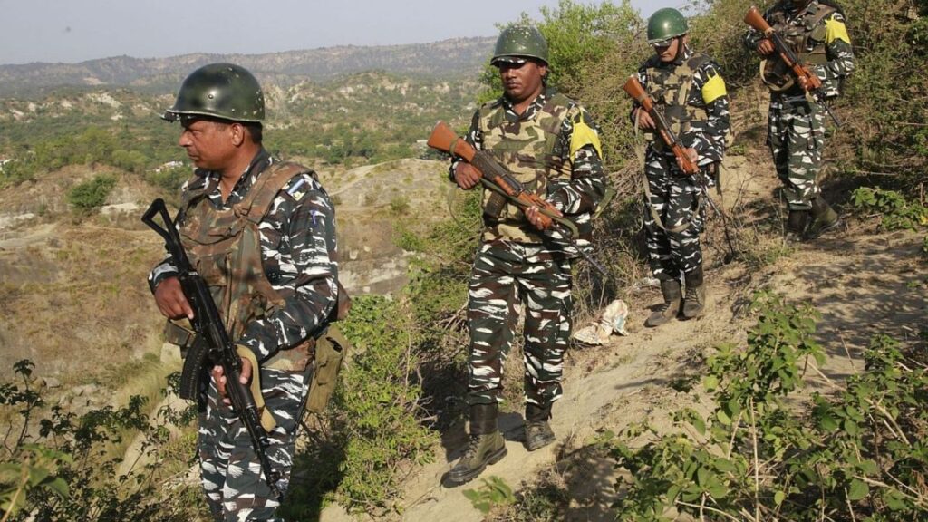 [Image 1: CRPF personnel in combat fatigues demonstrating paramilitary organization]